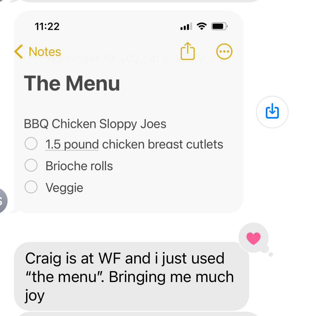 I do this for 5-6 meals weekly and for breakfast, lunch, and dinner for my well-being and as a caretaker for a partner whose ability was really hurt by a car accident. The ingredients overlap in fun ways so nothing gets wasted, and also so we don’t get tired of them during the week. The functionality of the checklist moving items to the top depending on what you check is everything to me. Keeps me clear. I have hundreds of these notes and feeling inspired to curate them into something entertaining, like a little magazine!