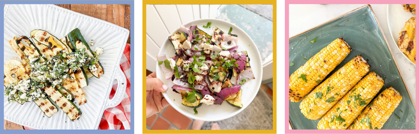 Grilled summer squash and zucchini: Remove the ends and cut them into long thin planks. Lightly coat with olive oil and season with salt, pepper, and a little Italian seasoning. Grill for 4 minutes per side or until dark grill marks appear and they’re very tender. Delish as is, or drizzle with marinated goat cheese, or pull apart a burrata ball and place it over top. Drizzle with balsamic.