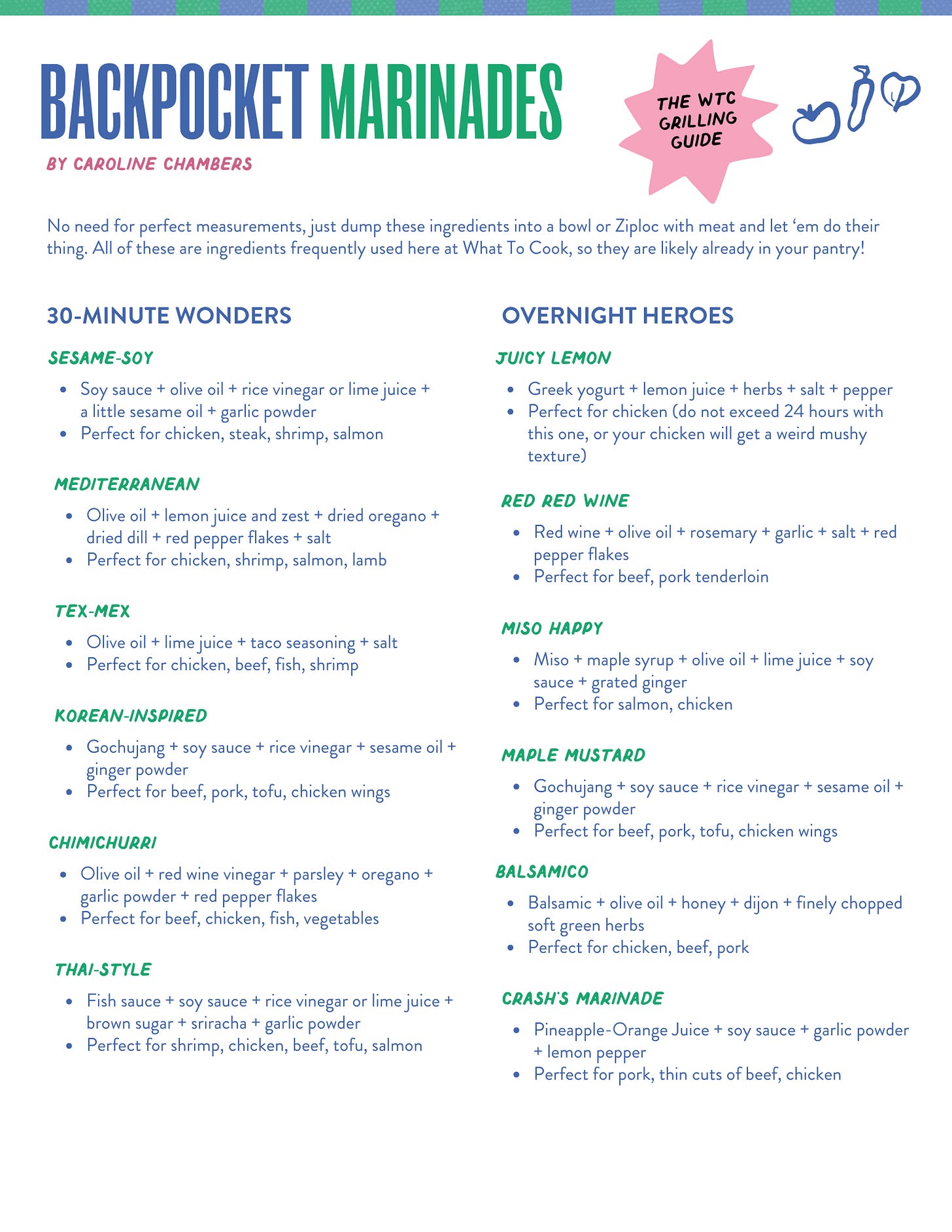 No need for perfect measurements, just dump these ingredients into a bowl or Ziploc with meat and let ‘em do their thing. All of these are ingredients frequently used here at What To Cook, so they are likely already in your pantry!