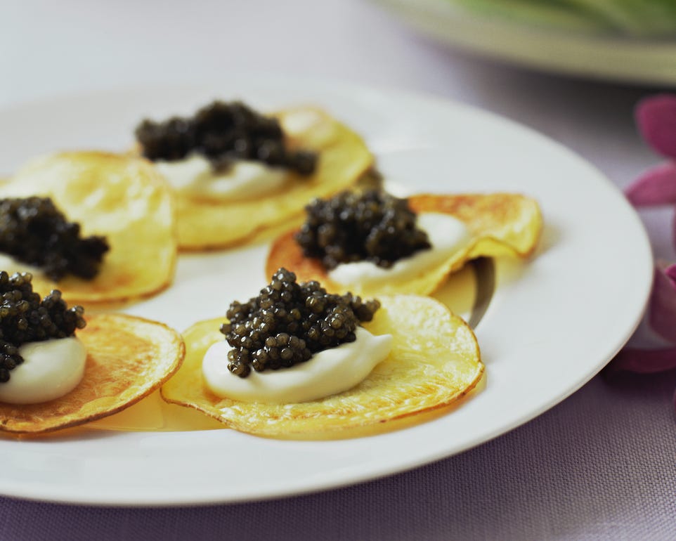 Potato Chips + Creme Fraiche + Caviar // Classic and elegant. Set out a big pretty bowl with the fanciest plain potato chips you can find, a little bowl of creme fraiche, and the caviar straight out of the tin. Chip + dollop of creme fraiche + dollop of caviar! I let guests do it themselves, but you can also pre-make each bite and serve it like a canapé. Caviar is expensive but it’s NYE and you don’t have COVID so live a little!