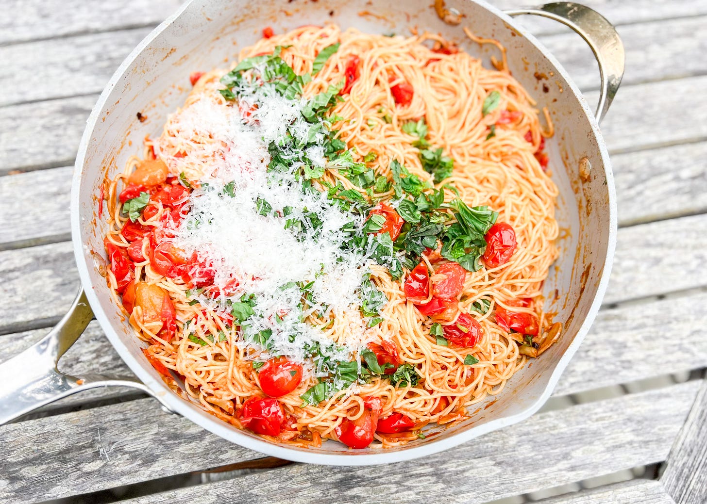 It’s tiny tomato season! We aren’t growing tomatoes of our own this year, but a trip to the Carmel-by-the-Sea farmer’s market this past week told me everything I need to know: it’s tiny tomato pasta time. They’re everywhere! They’re sweet and juicy and begging to be made into a sauce!
