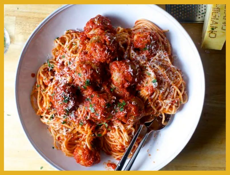 DEB: Perfect meatballs and spaghetti and a big salad with fancy Caesar dressing — or a bolognese that I’ve cooked all day, plus brownies
