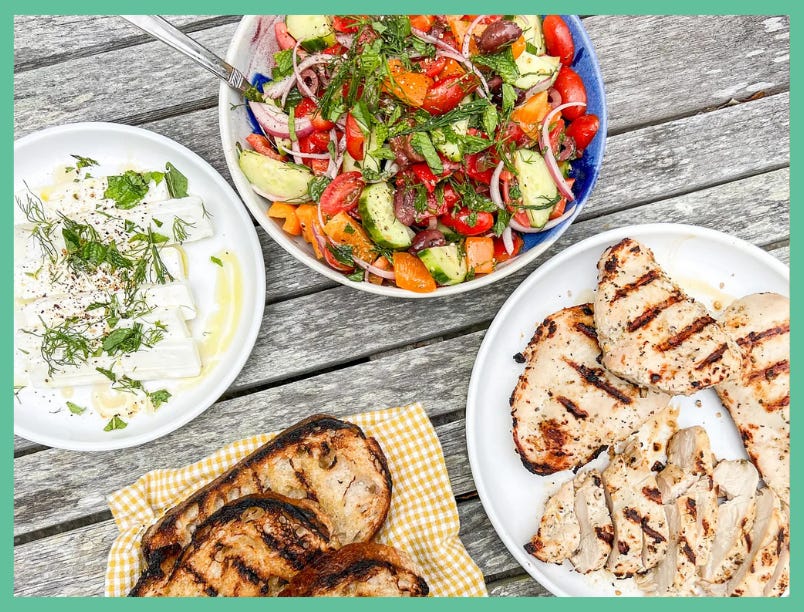 CARO: A fattoush-y Greek salad and grilled chicken (so like the show off-y Greek salad with crumbled pita added, plus perfect grilled chicken)
