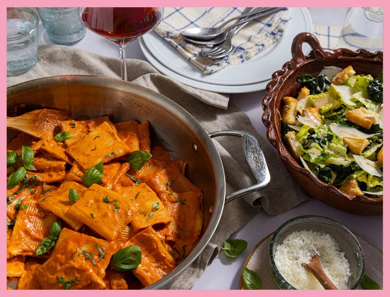 CARO: Pasta alla vodka and a Caesar salad, with the whole menu included in that post, plus a skillet cookie (page 255 in What to Cook When You Don’t Feel Like Cooking the book)