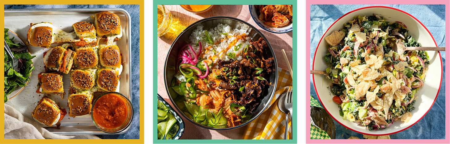 Sheet-pan sliders: Take a pack of King’s Hawaiian rolls and, without separating them, slice the whole dozen in half horizontally using a serrated knife. Spread a condiment or two on the bottom layer of the buns (I usually go with Dijon and mayo) and another condiment on the top layer of buns (I like a jam or jelly here!). Add a layer of meat on the bottom bun (like ham slices, turkey slices, shredded rotisserie chicken, etc.) followed by a layer of cheese (Brie, Cheddar, American, Gouda — whatever!) then add the top bun. Brush melted butter on top of the buns and sprinkle with everything bagel seasoning. Bake tented with foil at 375°F for 10 minutes, then uncovered for another 2 to 5 ish minutes, until the cheese is melted and the top buns are lightly golden. Let them cool for a few minutes then slice and serve!