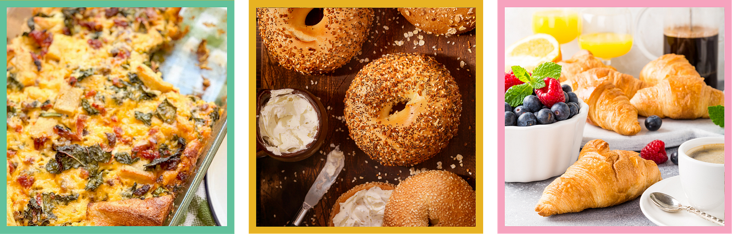 A bagel bar: Buy some fresh bagels and set them out with a few cream cheese flavors and some sliced avocado and flaky sea salt.