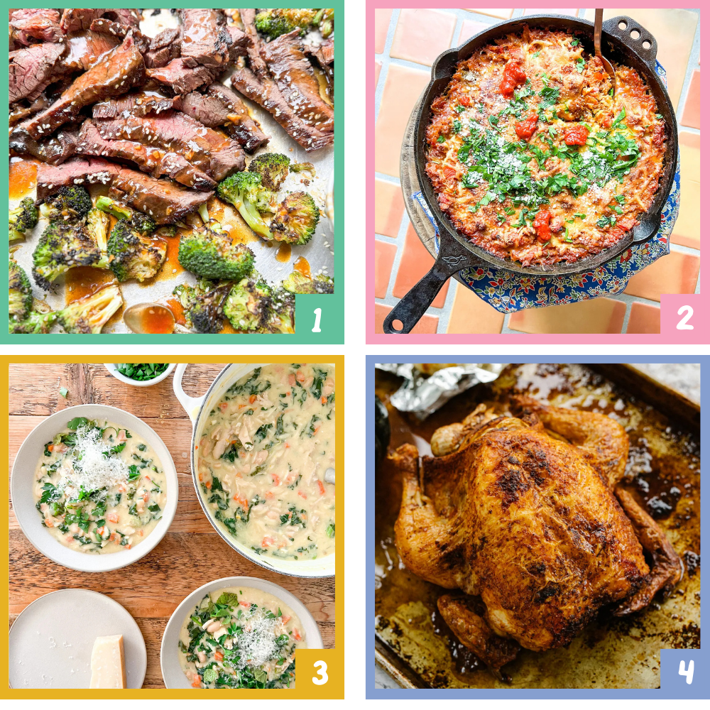 A bowl bar: Cook a few elements and set them out family-style for people to build their own bowls! You can follow a recipe like beef bulgogi bowls, or just wing it with what you’ve got or are in the mood for. Here are the elements that I like to include and some ideas for each: