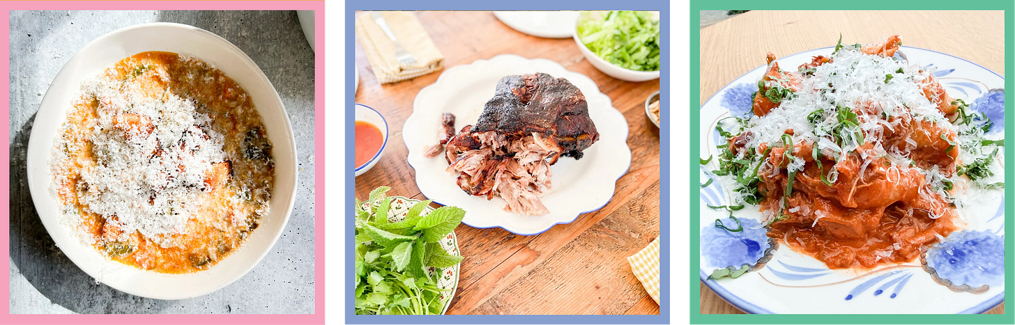 Bo ssam: This is a fixture during our Sexy Santa weekend, we make it the Saturday night of the weekend every time! A big ole piece of meat that can cook low and slow while you go about your day is such a smart move when you’re hosting. It’s also ideal because guests can build their own bowl or lettuce wraps based on their taste and dietary preferences. Cook my slow-roasted pork butt and serve it up bo ssam style with the sauces, coconut rice, and fixins laid out here. If you have What To Cook the book (on sale at most retailers!), you can follow the bo ssam recipe instructions on page 238!