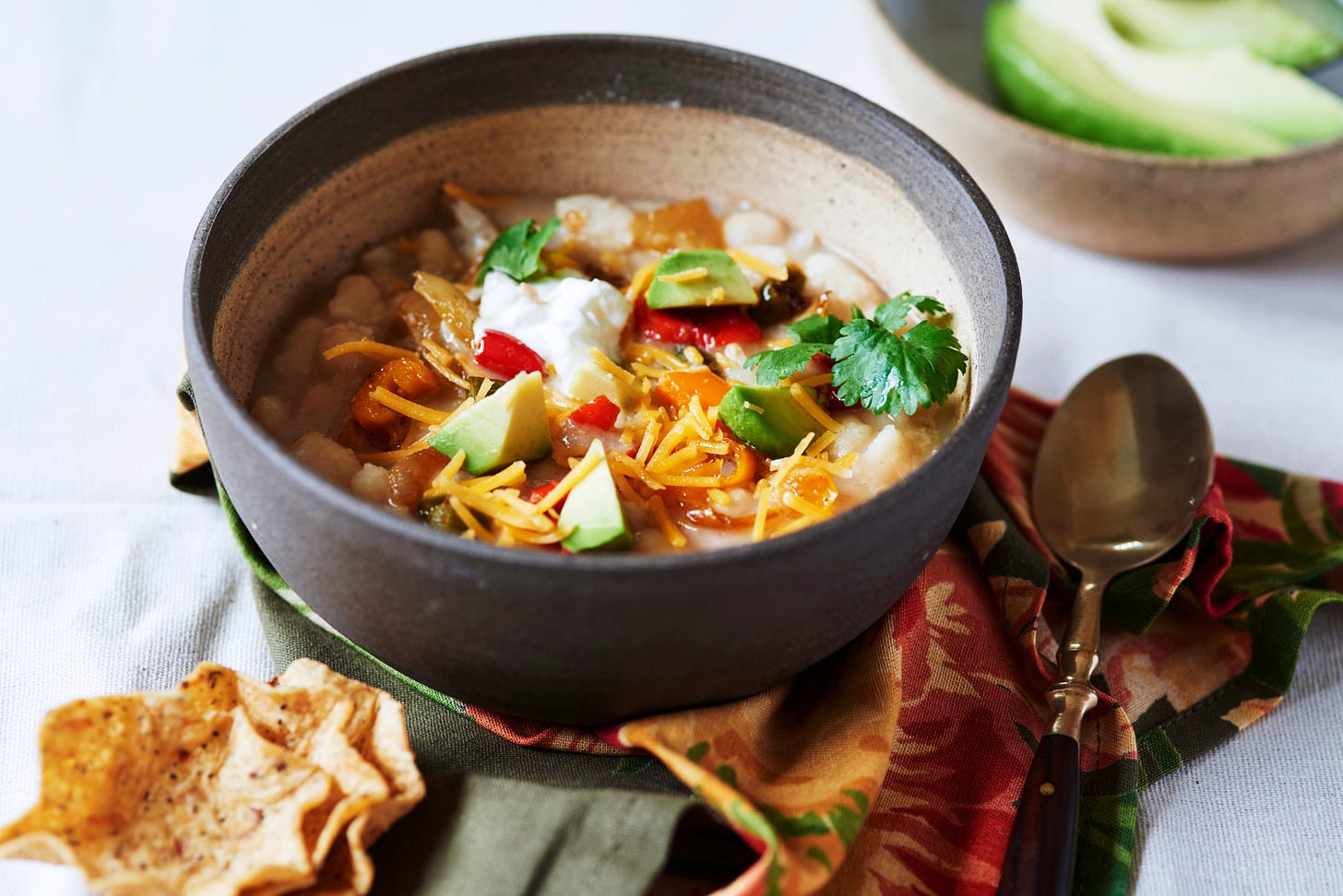 And then you load avocado, tortilla chips, cilantro, cheese, salsa, you name it, on top. It’s white chili but it’s not all white, getting some festive red or yellow or green from the peppers, so I just call it White Bean Chicken Chili.