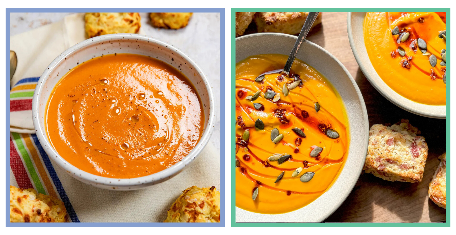 a veggie-packed tomato curry soup with the perfect crunchy topping
