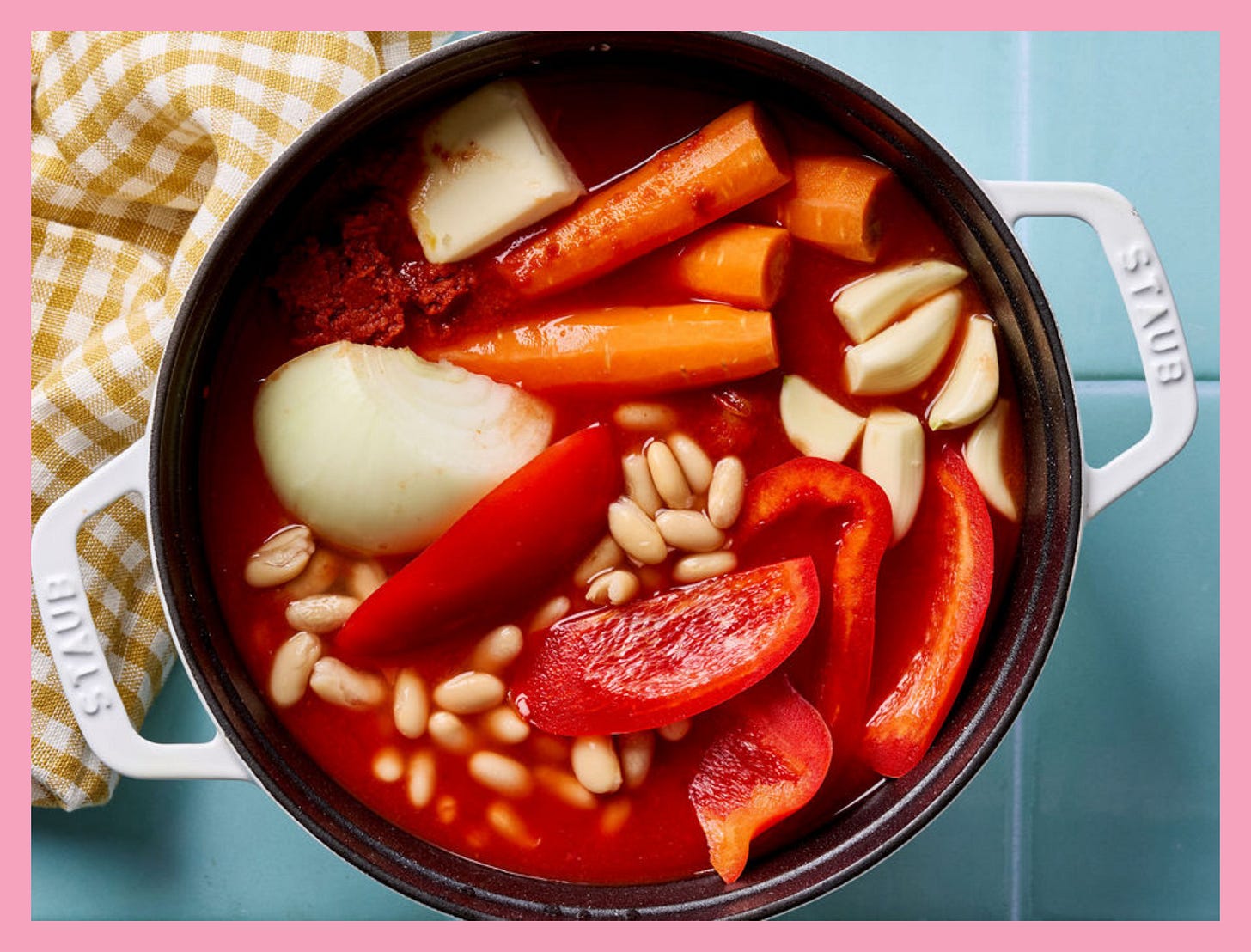 We’ve got red bell pepper (did you know they contain more vitamin C per cup than oranges?), carrots, onion, garlic, and red curry paste, which bundles lemongrass, coriander, and more all in one scoop. We’re adding a can of white beans for high-fiber plant-based protein, and some coconut milk for even more cream-less creaminess. The result is a comforting, warming, filling, nourishing, and absolutely delicious bowl of soup.