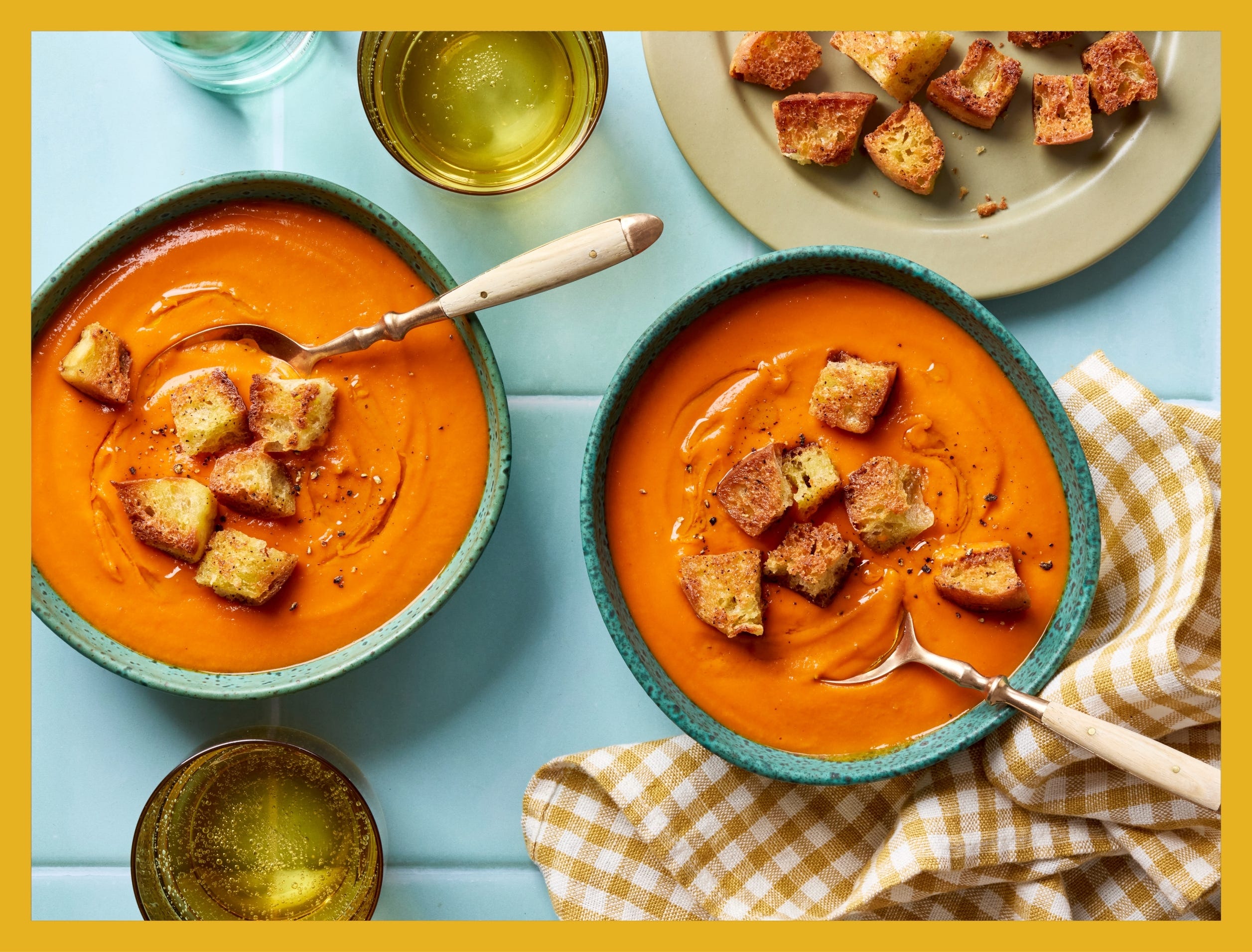Here’s the cult fave, and much more classic tomato soup: creamy but cream-less vegetable-filled tomato soup. In that recipe, we use cashews for creaminess and we cook the ingredients on the stove top versus in the oven. For another puréed soup, cook my butternut squash soup, and if you have What to Cook the book, the roasted peanut carrot soup on page 237 is another winner!
