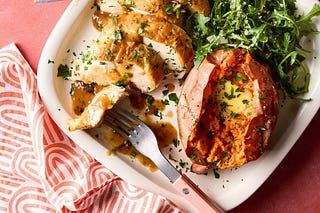 roast chicken with onion gravy and sweet potatoes